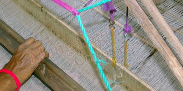 Mangalagiri Handlooms use unique way of processing warp yarn. Each warp is for 4-5 sarees. So, it is very important to make sure all the threads in the warp are smooth and not attached with one other. The above image show our warp process.
